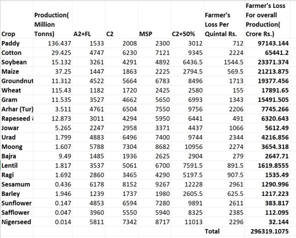 Considering the crops including milk, entire commercial crops, vegetables, fruits, meat, egg, fish etc. out of the current MSP system and procurement , the losses Indian peasantry suffers is manifold higher, leading to indebtedness, suicides daily on an average of 31 farmers; all this is to ensure corporate profit under the corporate -communal BJP led NDA regime.