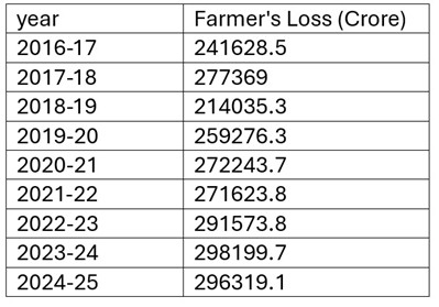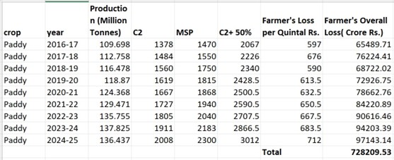 Over the last nine years (2016–2025), farmers growing these 20 crops have collectively lost an estimated ₹24 lakh crore in income solely because the C2 + 50% formula was not implemented, even under the assumption that the entire production was procured at the official Minimum Support Prices (MSP) which is unreal.