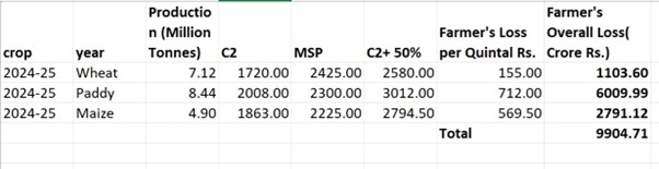 According to the Second Advance Estimates of Production for 2024–25, farmers cultivating the 20 major Kharif and Rabi crops could have earned nearly ₹3 lakh Crore Rupees more if their produce had been procured at prices determined by the Swaminathan Commission’s recommended formula of *C2 + 50%.(see table -1).