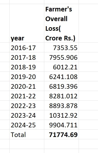 Among the 20 crops, Paddy, being the most widely cultivated crop, accounts for the largest losses — approximately ₹97,000 crore in 2024–25 alone, and over ₹7 lakh crore cumulatively during the last nine years.